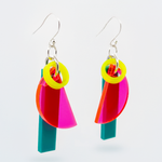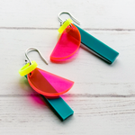 Bold geometric earrings in vibrant neon pink, yellow, and teal. Inspired by retro arcade games with a modern twist.