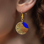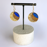 Striking circular earrings featuring bold blue and gold geometric patterns with textured metallic details. Inspired by celestial movements with contemporary flair.