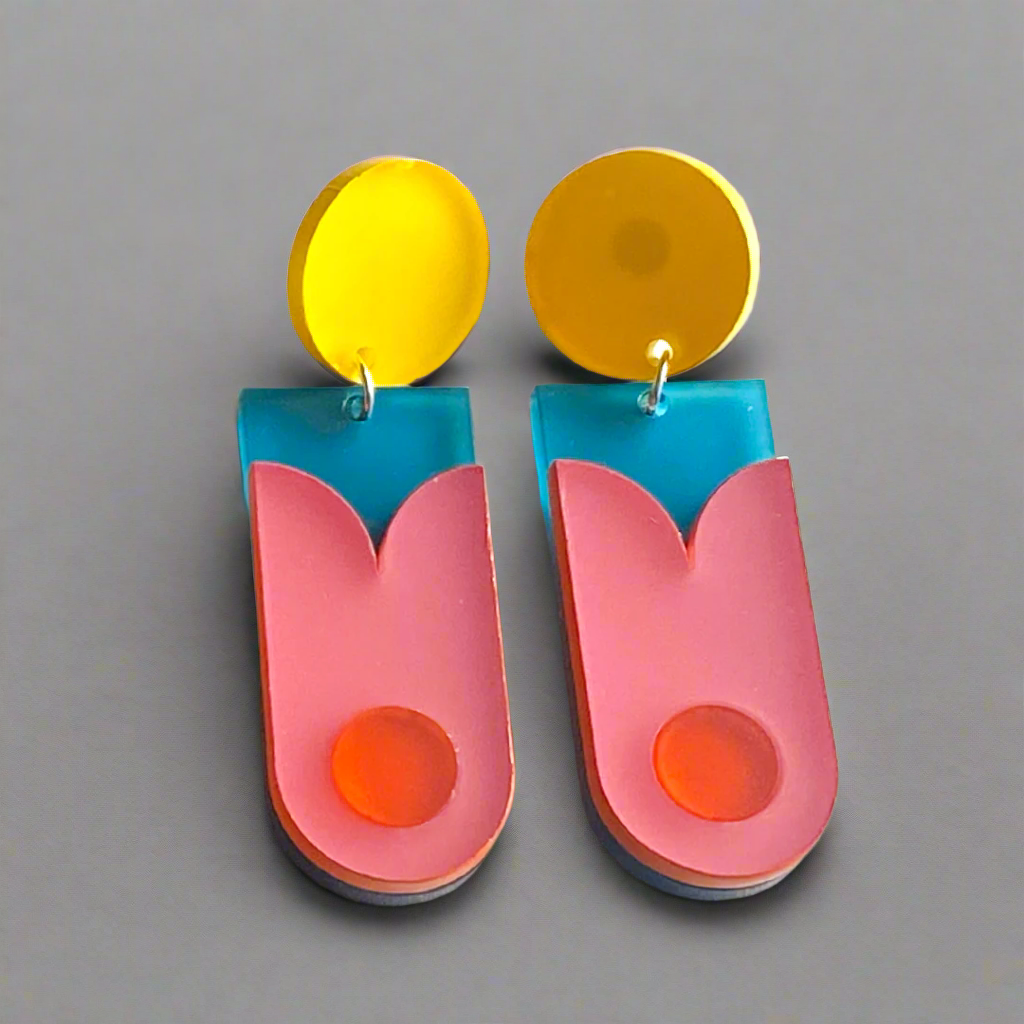 Embrace a burst of colour and creativity with the GeoPlay Bloom earrings. Inspired by the natural beauty of blossoming flowers and bold geometric shapes, these earrings showcase a delightful blend of pink and teal acrylic layers. The fluid curves and vibrant hues create a captivating design that's sure to brighten up any outfit and turn heads wherever you go.