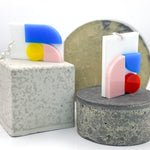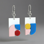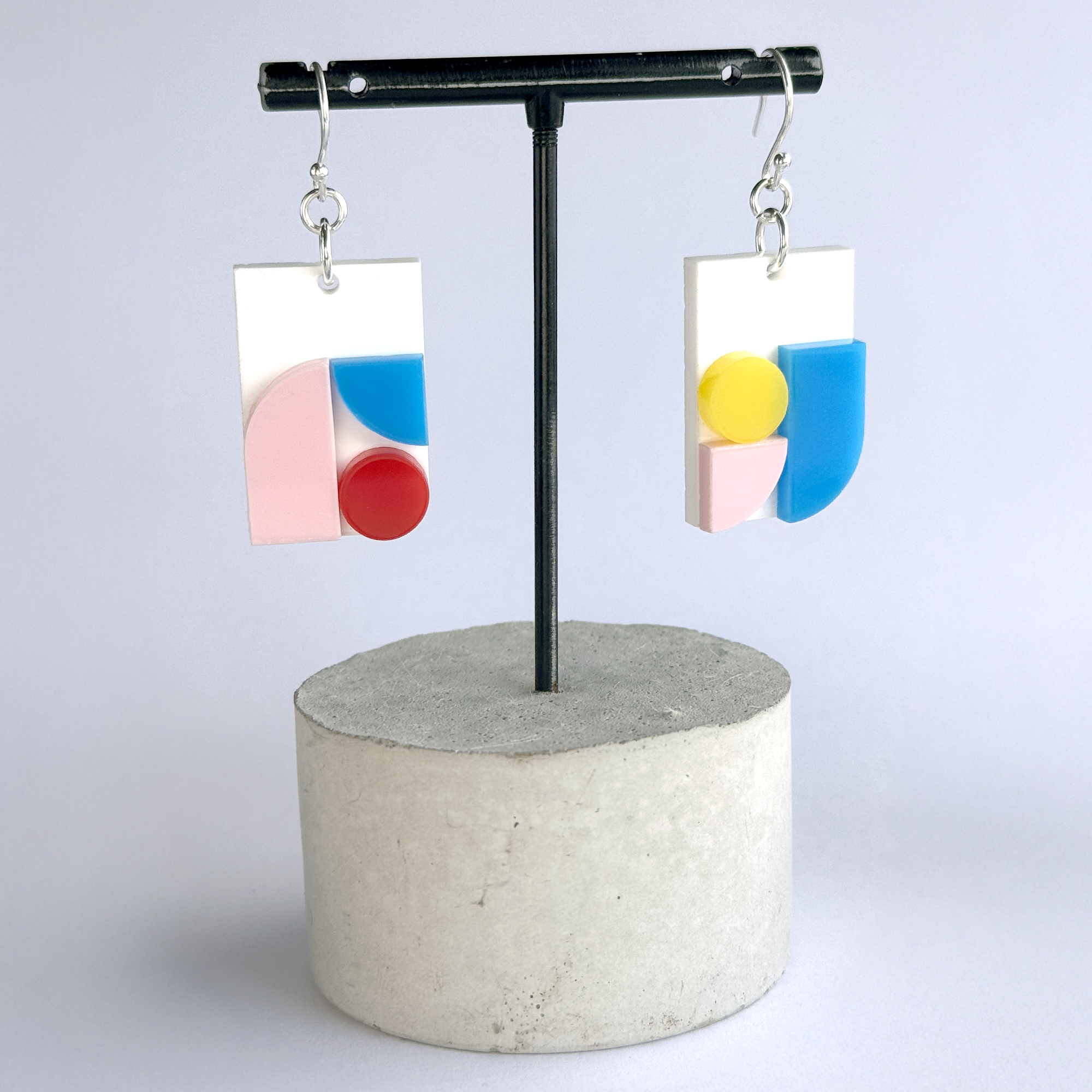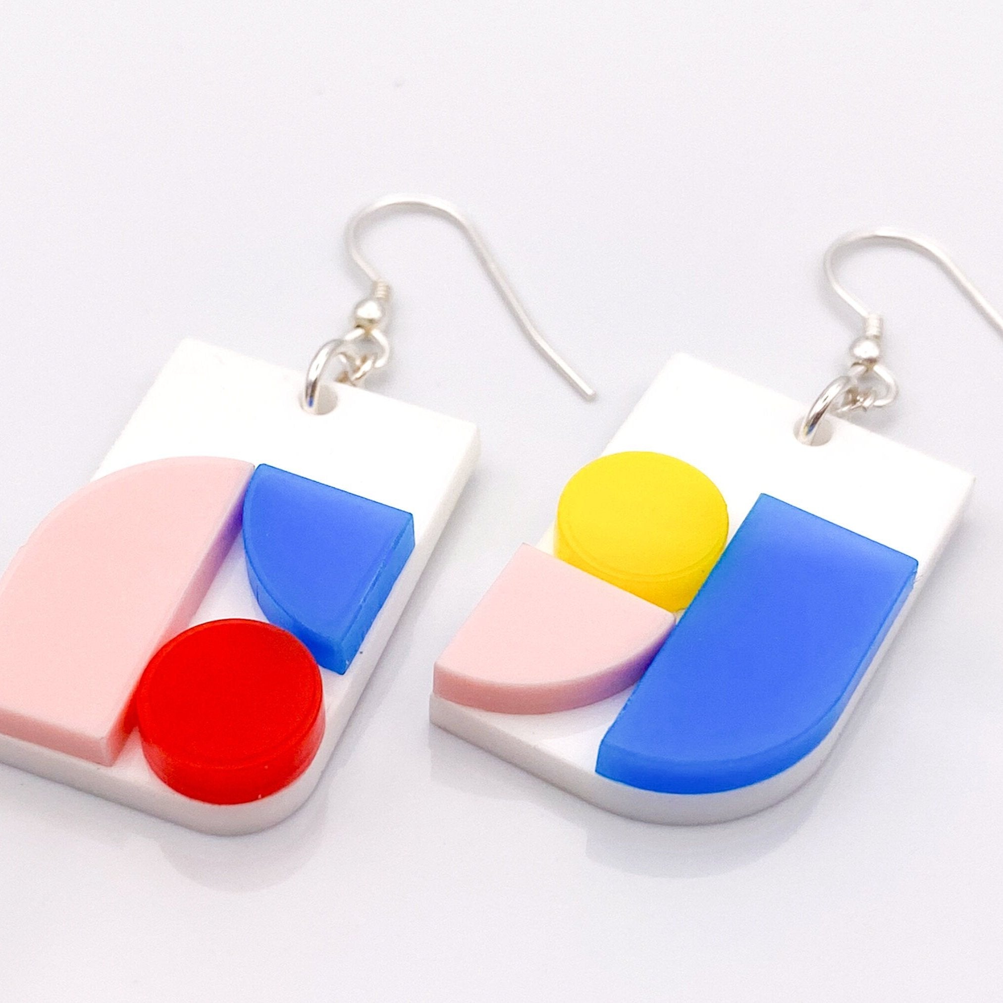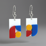Clean geometric earrings in crisp colours with balanced Bauhaus proportions and minimalist appeal. Sophisticated design with timeless elegance.