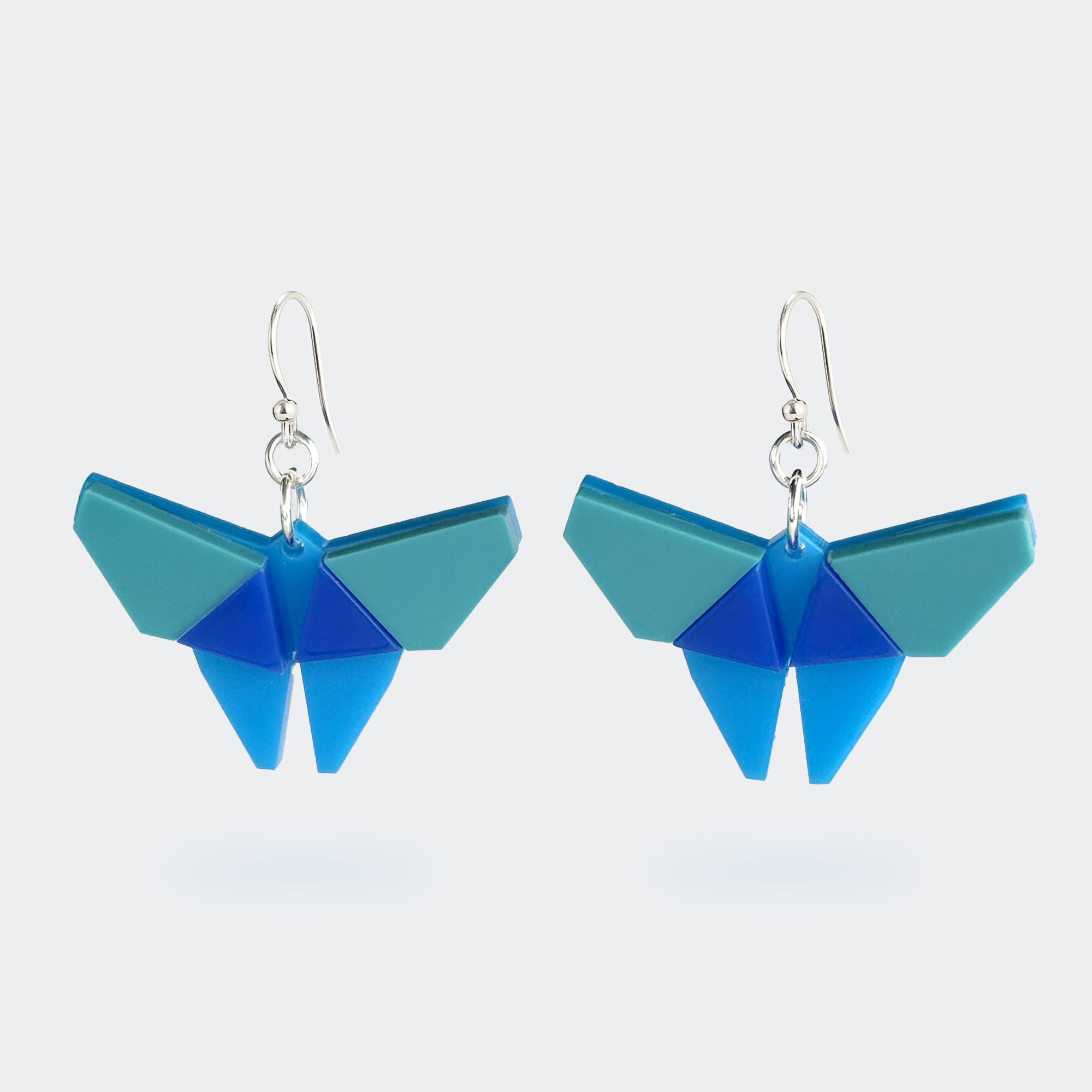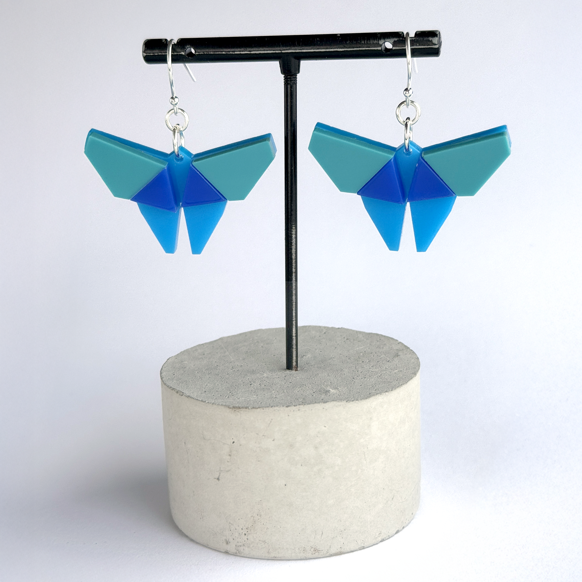 Elegant geometric butterfly earrings in rich blue and teal with origami-inspired wing forms. Graceful design with contemporary appeal and natural beauty.