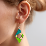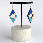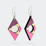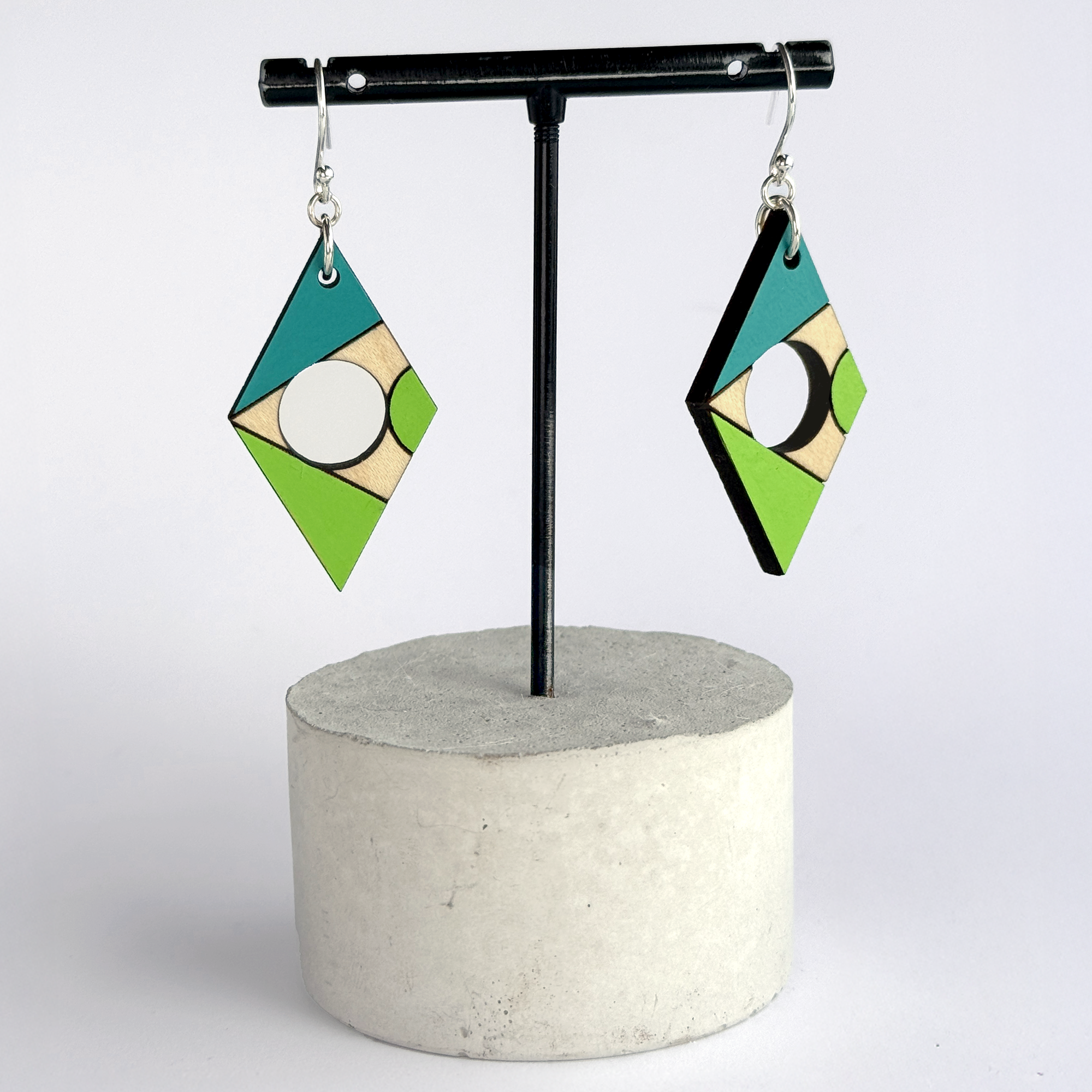 Dynamic diamond-shaped earrings in bold tones with geometric patterns and painted accents. Beautiful contemporary design.