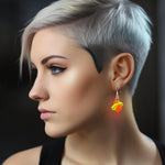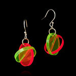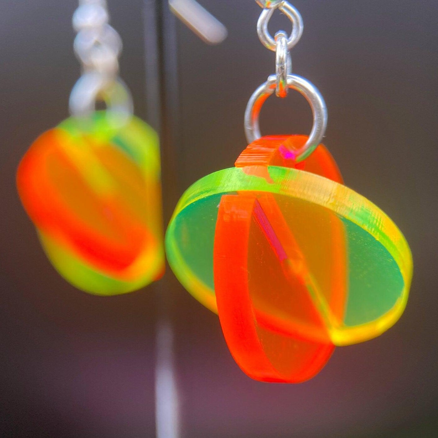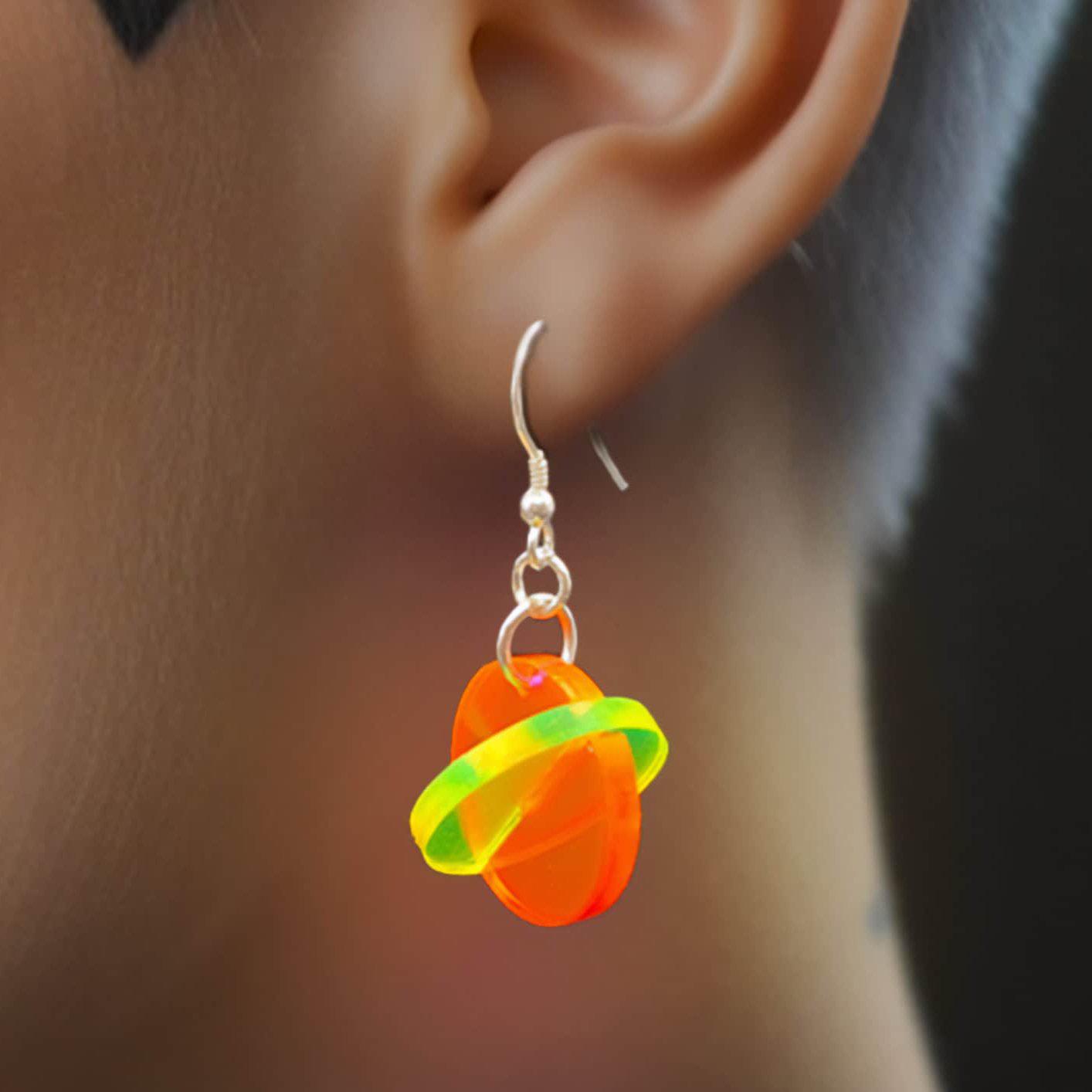 Cosmic-inspired earrings in vibrant neon with planetary geometric forms and orbital details. Contemporary space-age design with retro appeal.