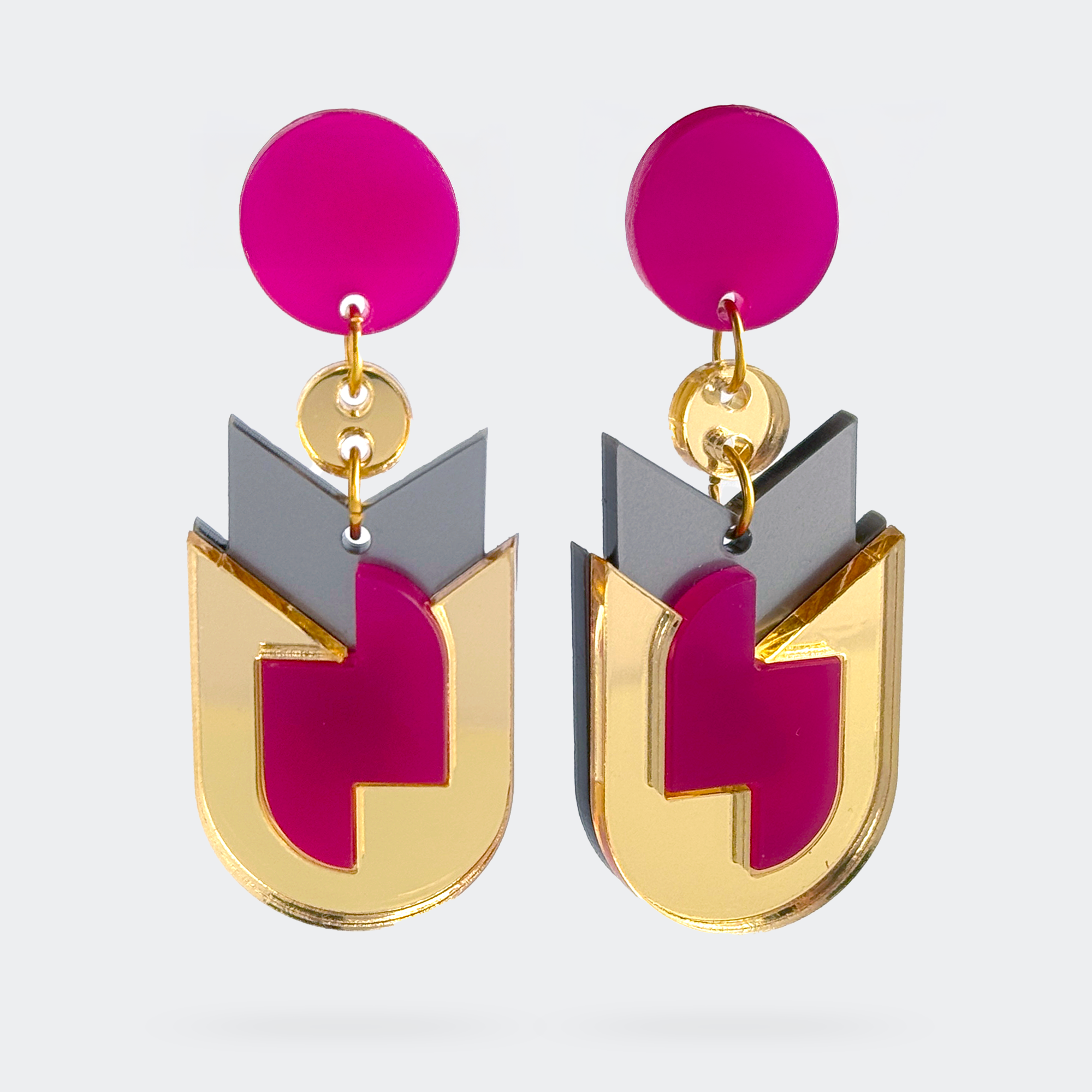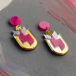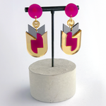 Elegant geometric earrings in pink and gold with refined Bauhaus proportions and gold details. Sophisticated design with contemporary appeal.