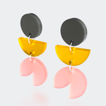 Playful curved earrings in bright colours with twisted geometric forms and charcoal accents. Contemporary design with organic movement.