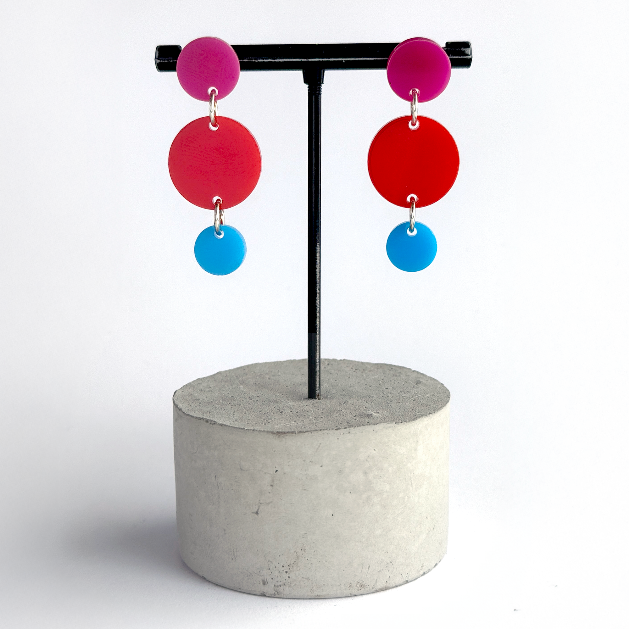 Elegant layered earrings with graduated circular forms in vibrant pink, red and blue. Contemporary design with sophisticated colour progression and balanced proportions.