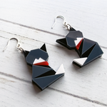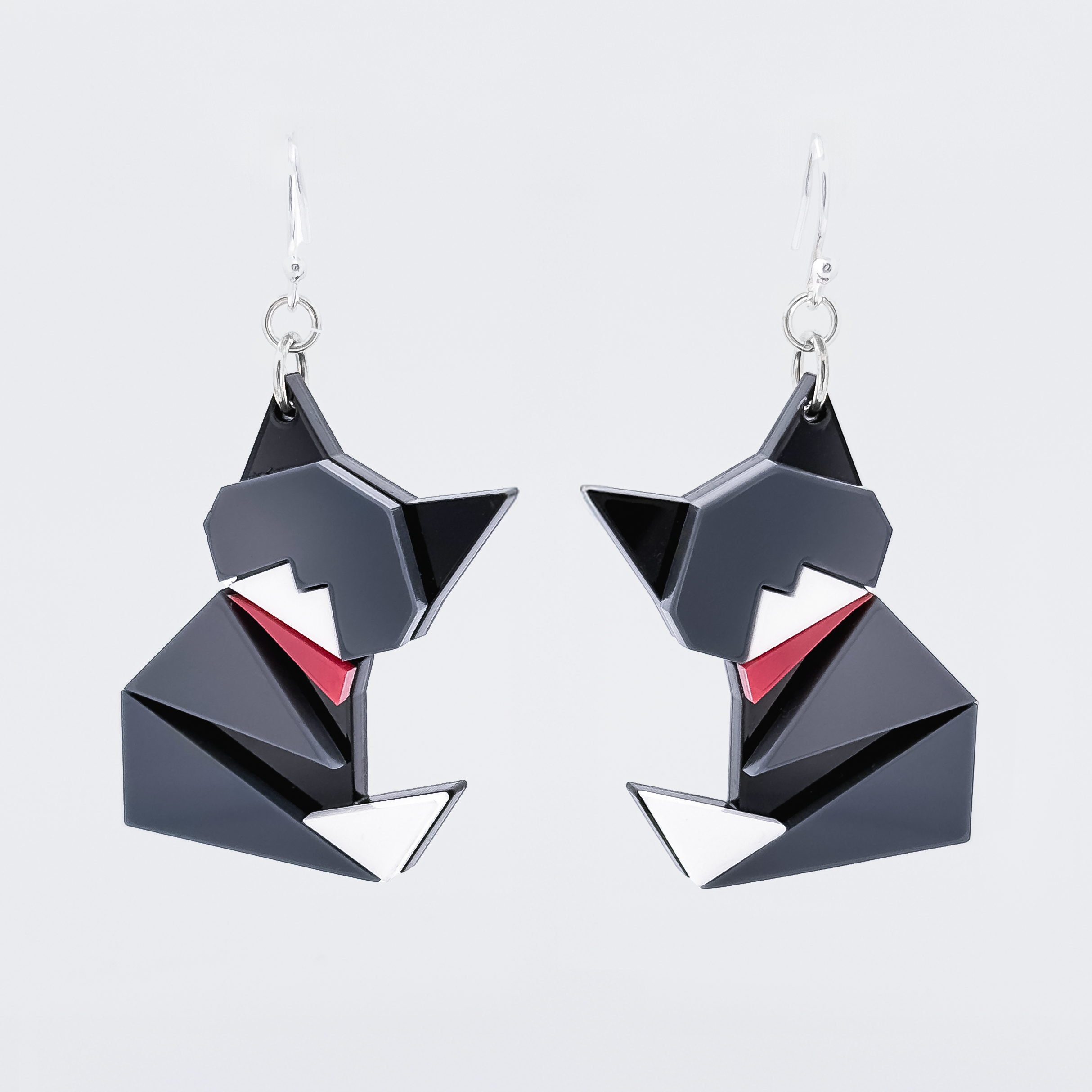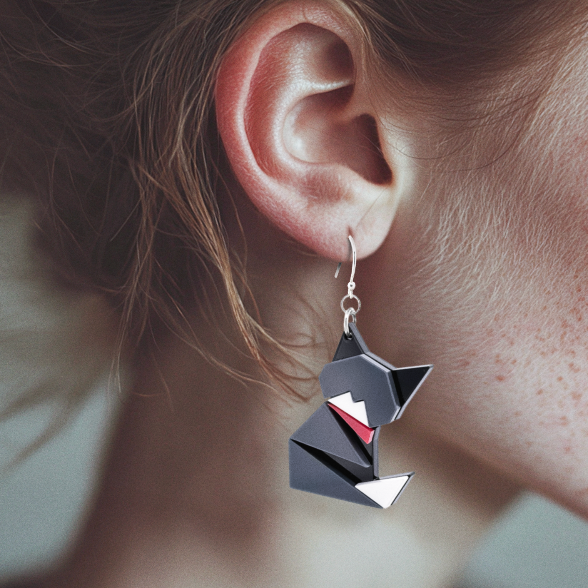 Sleek geometric cat earrings in classic black and white with origami-inspired angular design. Sophisticated style with playful character and contemporary edge.