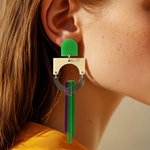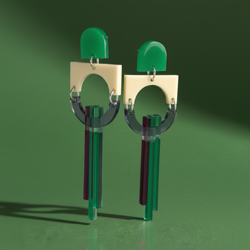 Dynamic statement earrings in layered green, plum, and cream acrylics. A sculptural composition with geometric precision and a hint of movement. The contrast of translucent and opaque finishes gives subtle depth and energy.