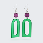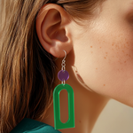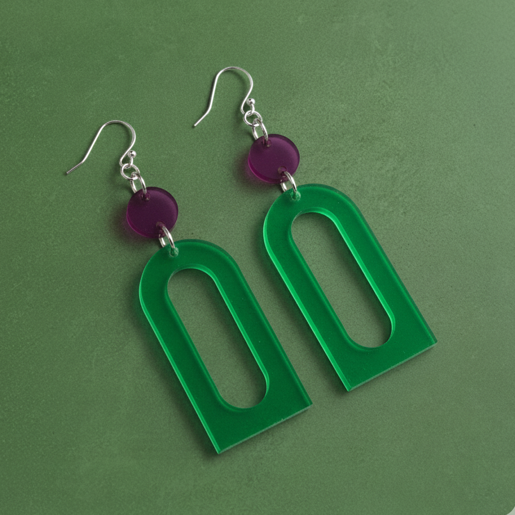 Sleek geometric earrings in translucent green and deep plum tones, defined by clean lines and contemporary form. Minimal yet striking, the open arch design creates balance and lightness.