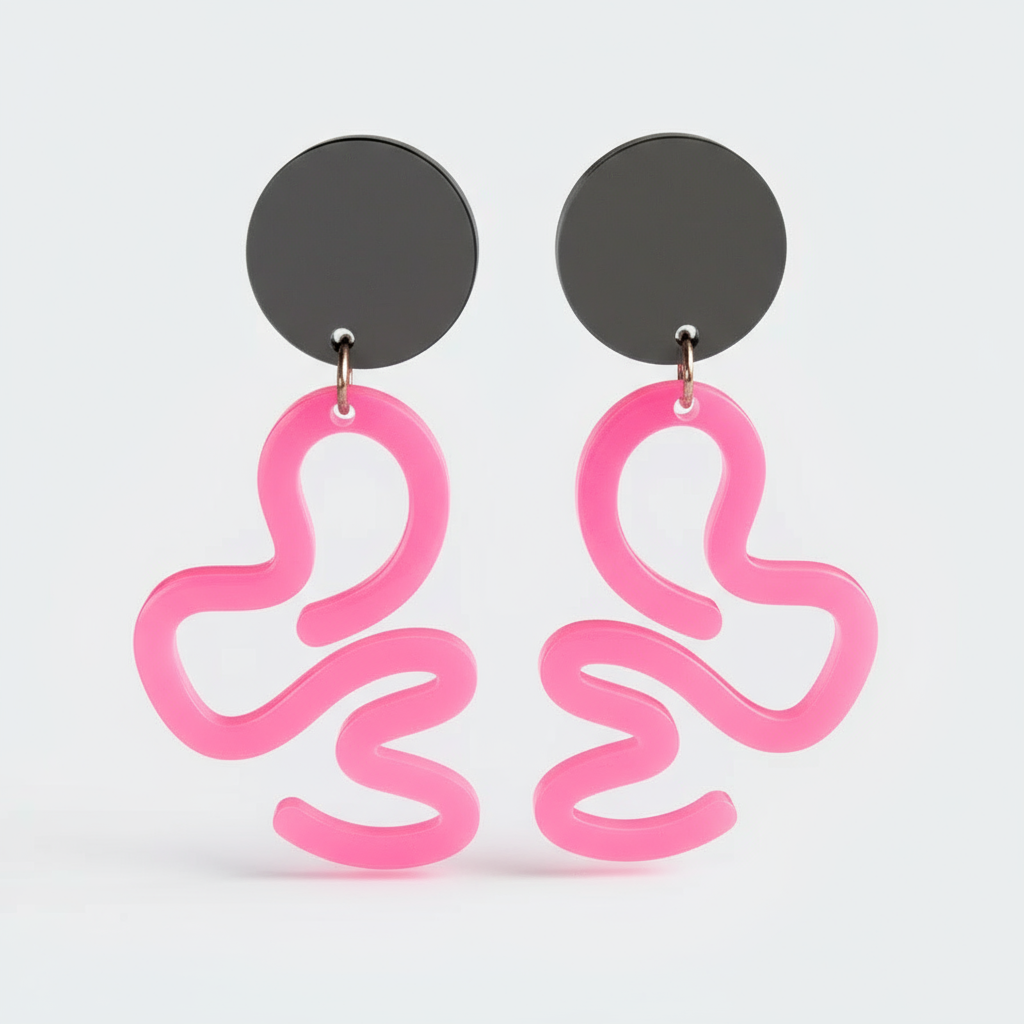 Playful curved earrings in vibrant pink with organic squiggle shapes and charcoal accents. Fun geometric design inspired by retro arcade aesthetics.
